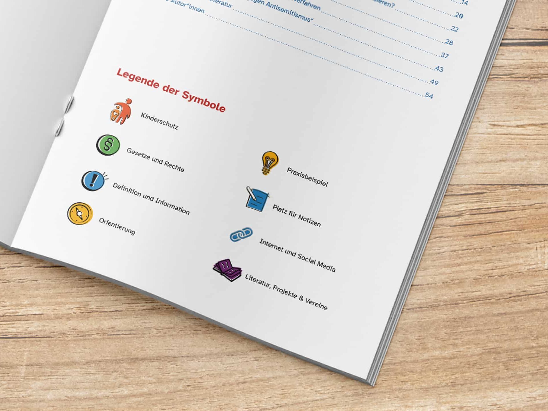 Ein zentrales Gestaltungselement war die Entwicklung einer eigenständigen Iconografie, um verschiedene Textabschnitte und Informationsschwerpunkte klar zu kennzeichnen. Die individuell gestalteten Icons erleichtern die Orientierung, schaffen visuelle Wiedererkennbarkeit und geben der Publikation einen strukturierten, modernen Look. Die Gestaltung orientiert sich optisch am kindlichen Thema und setzt auf freundliche Formen und lebendige Farben, die Nähe und Offenheit vermitteln.