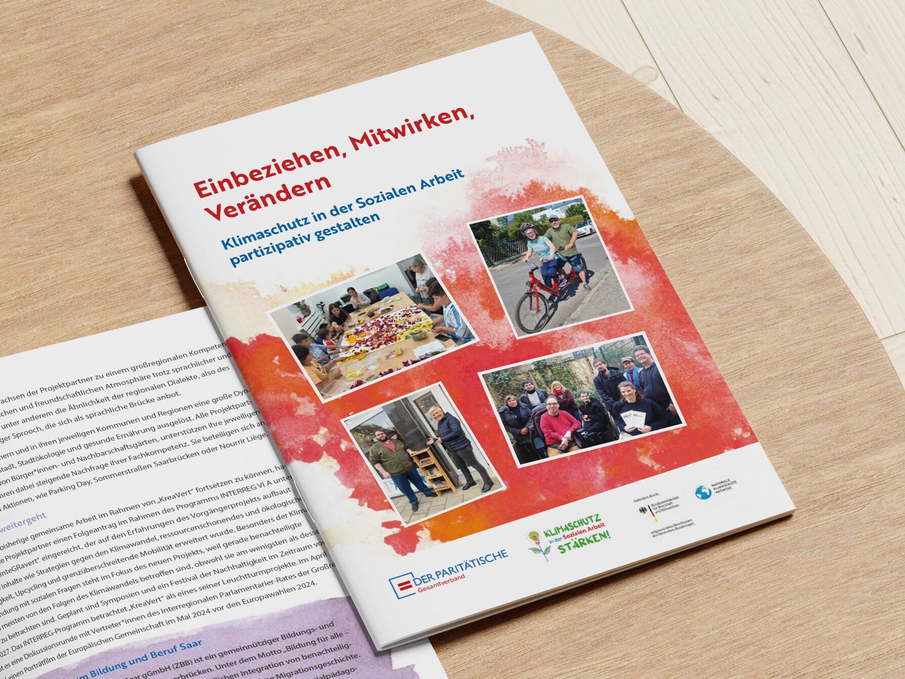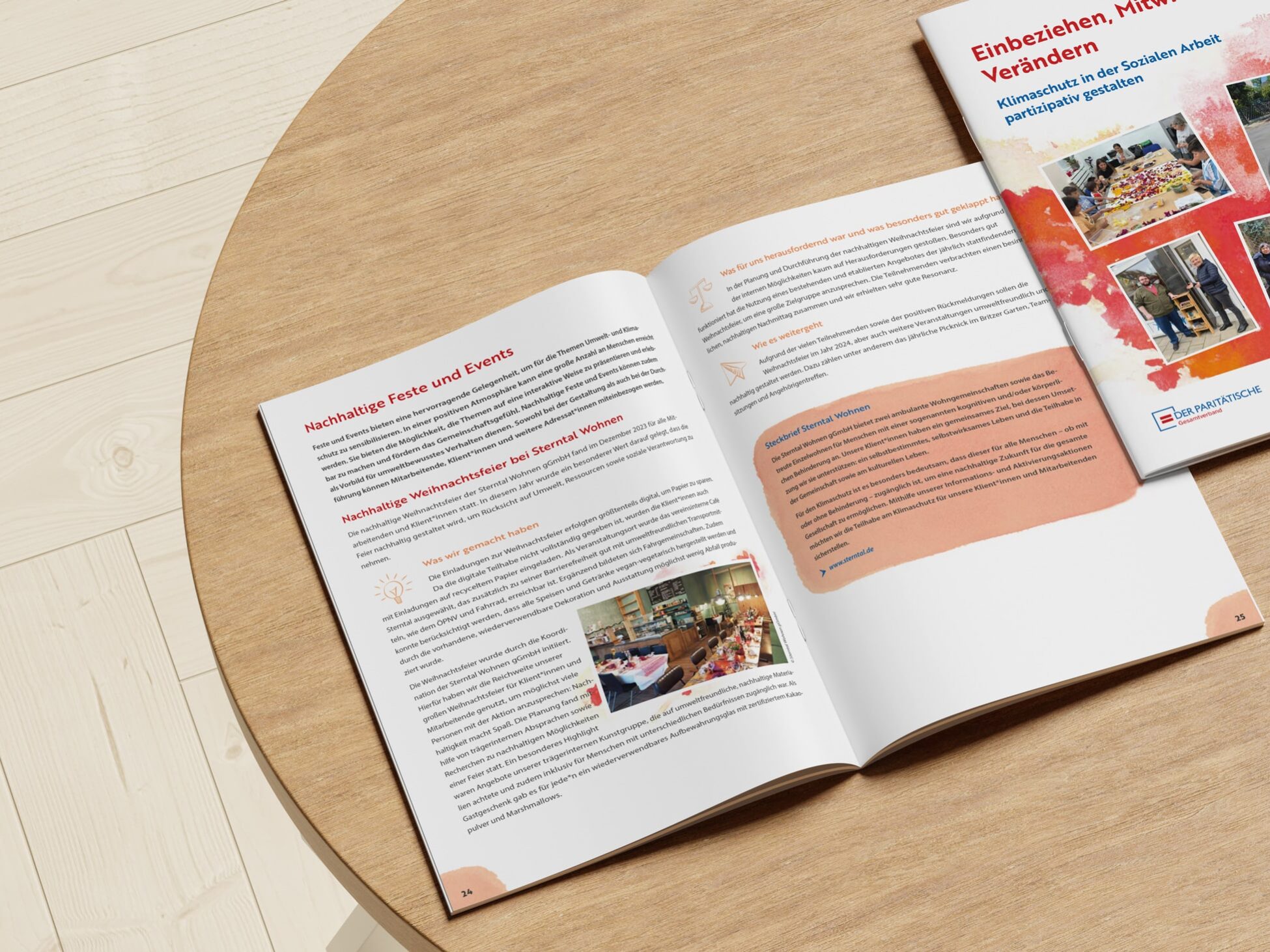 Die 76-seitigen Broschüre „Einbeziehen, Mitwirken, Verändern – Klimaschutz in der Sozialen Arbeit partizipativ gestalten“ des Paritätischen Gesmtverbands wurde von uns im Aquarell-Stil gestaltet. Die Broschüre zeigt wie partizipativer Klimaschutz in der Sozialen Arbeit gelingen kann anhand vieler Praxisbeispiele Paritätischer Mitgliedsorganisationen. Die Broschüre wurde unter Berücksichtgung des Corporate Designs des Paritätischen umgesetzt. Viele Fotos und Informationskästen im Aquarell-Stil heben die einzelnen Praxisbeispiele optisch hervor.