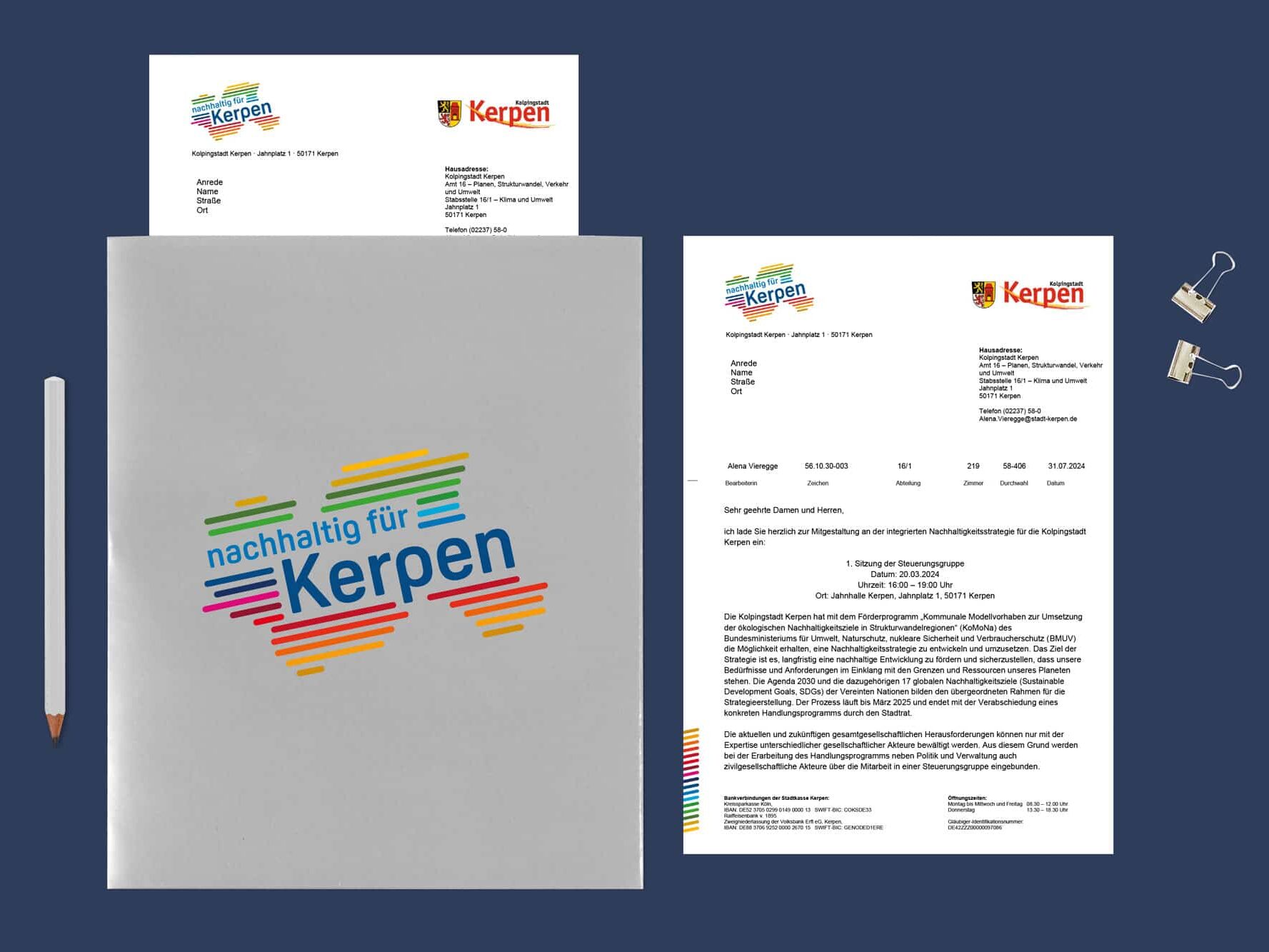 Im Rahmen des Projekts „Mit Blick ins Schöne“, welches durch das Förderprogramm KoMoNa unterstützt wird, wurden wir von der Kolpingstadt Kerpen mit der Entwicklung eines Corporate Designs für Nachhaltigkeitsstrategie beauftragt. Das Ziel war die Akzeptanz der Bevölkerung von Kerpen für die Nachhaltigkeitsstrategie zu steigern und einen roten Faden für die Kampagne zu haben.