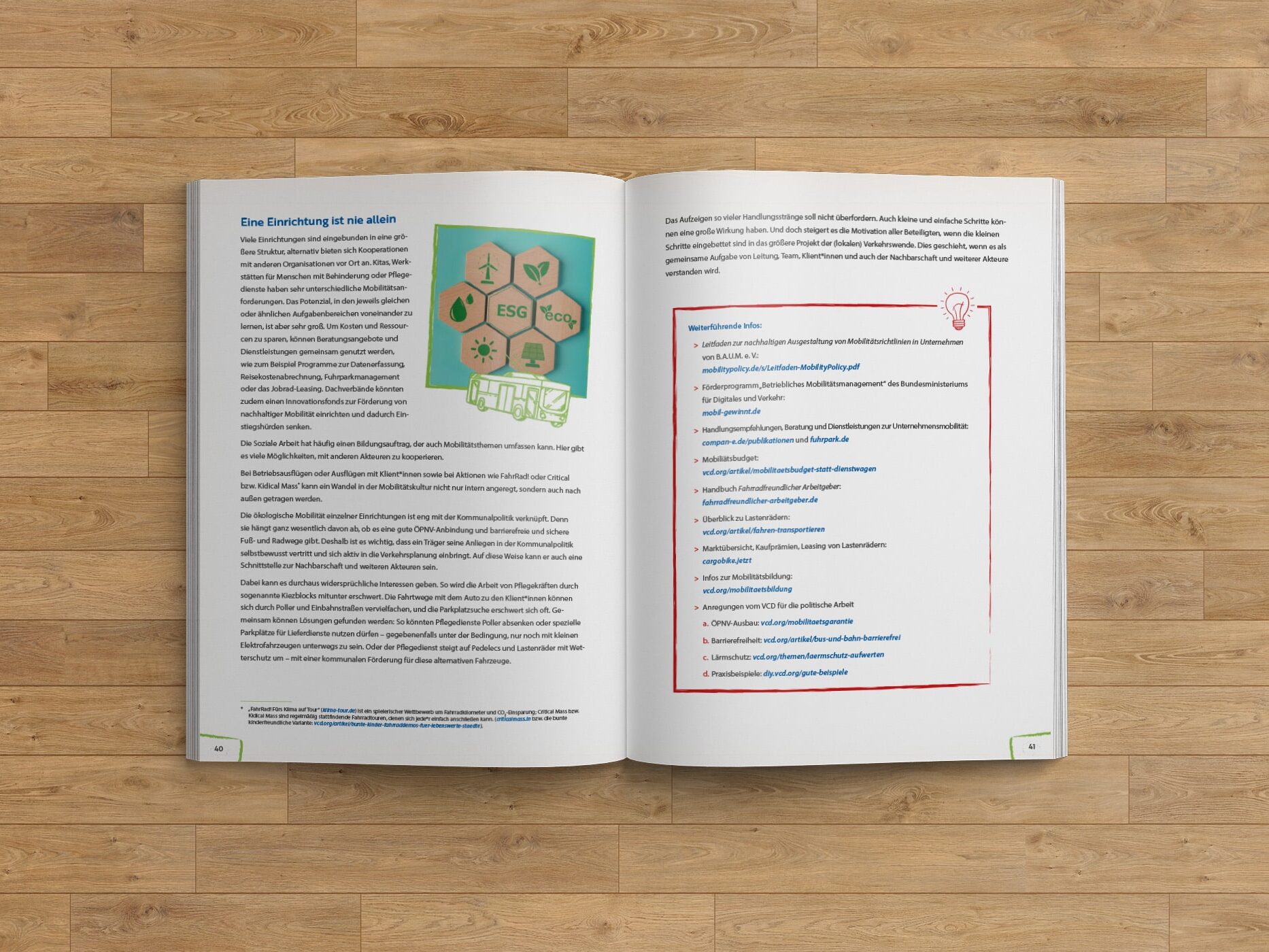 Die Broschüre „Klimaschutz in der sozialen Arbeit stärken – Handlungsempfehlungen für soziale Einrichtungen und Dienste“ des Paritätischen Gesamtverbands wurde von uns in 68 Seiten gestalterisch umgesetzt. Der illustrative Stil des eingegliederten Projekts „Klimaschutz ind er sozialen Arbeit stärken“ wurde durchgehend in allen Illustrationen, Grafiken und Icons gestaltet. Viele Praxisbeispiele mit Fotos zeigen die konkret umgesetzten Projekte in verschiedensten Einrichtungen und bieten eine gute Inspirationsquelle.