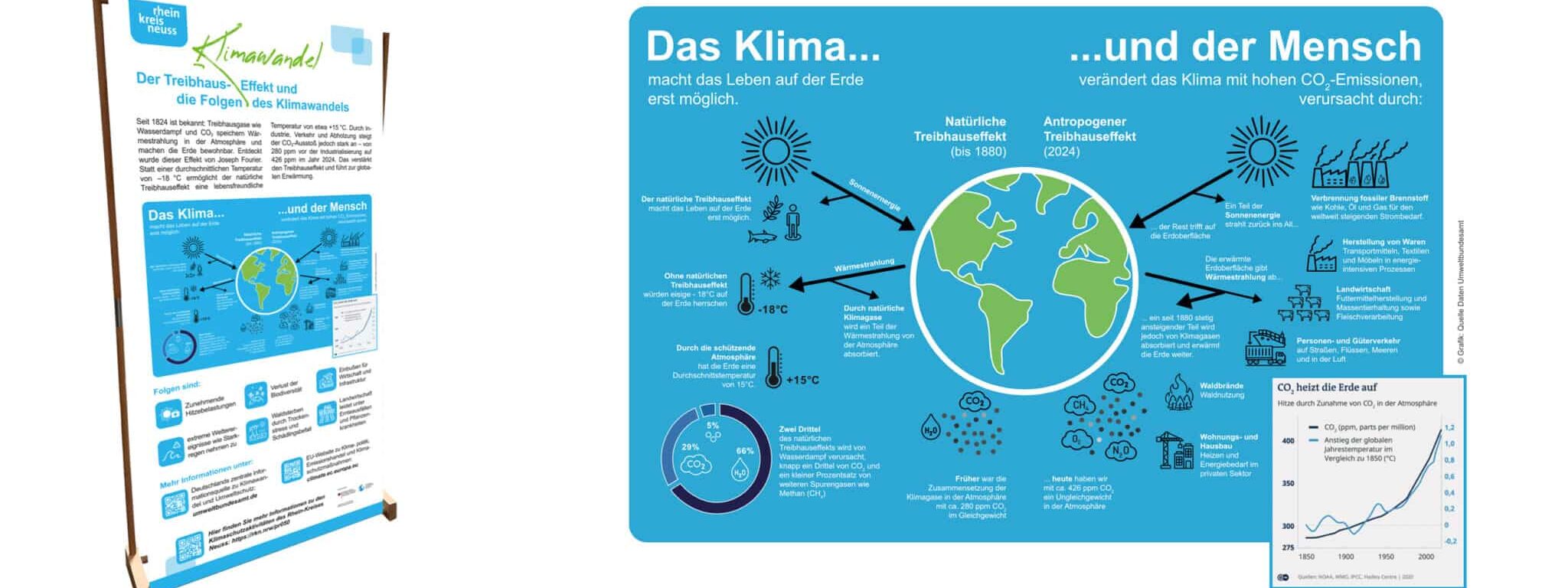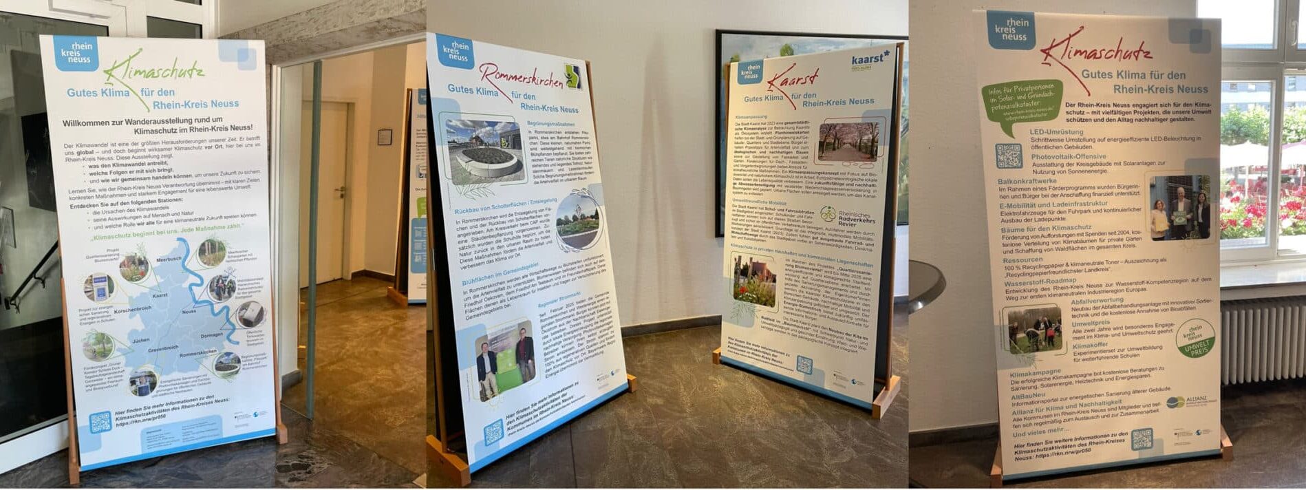Für den Rhein-Kreis Neuss entwickelten wir eine umfangreiche Wanderausstellung zum Thema Klimaschutz und Klimaanpassung nach dem Motto „Gutes Klima für den Rhein-Kreis Neuss“. Auf insgesamt 16 Roll-up-Motiven informieren die ersten sechs Tafeln über globale und lokale Klimafakten, geben praktische Tipps zum Klimaschutz und beleuchten die Auswirkungen des Klimawandels. Die weiteren zehn Motive stellen die Situation im Rhein-Kreis Neuss vor und präsentieren nachhaltige Projekte der einzelnen Kommunen – von erneuerbaren Energien über Mobilitätskonzepte bis zu grüner Stadtgestaltung.